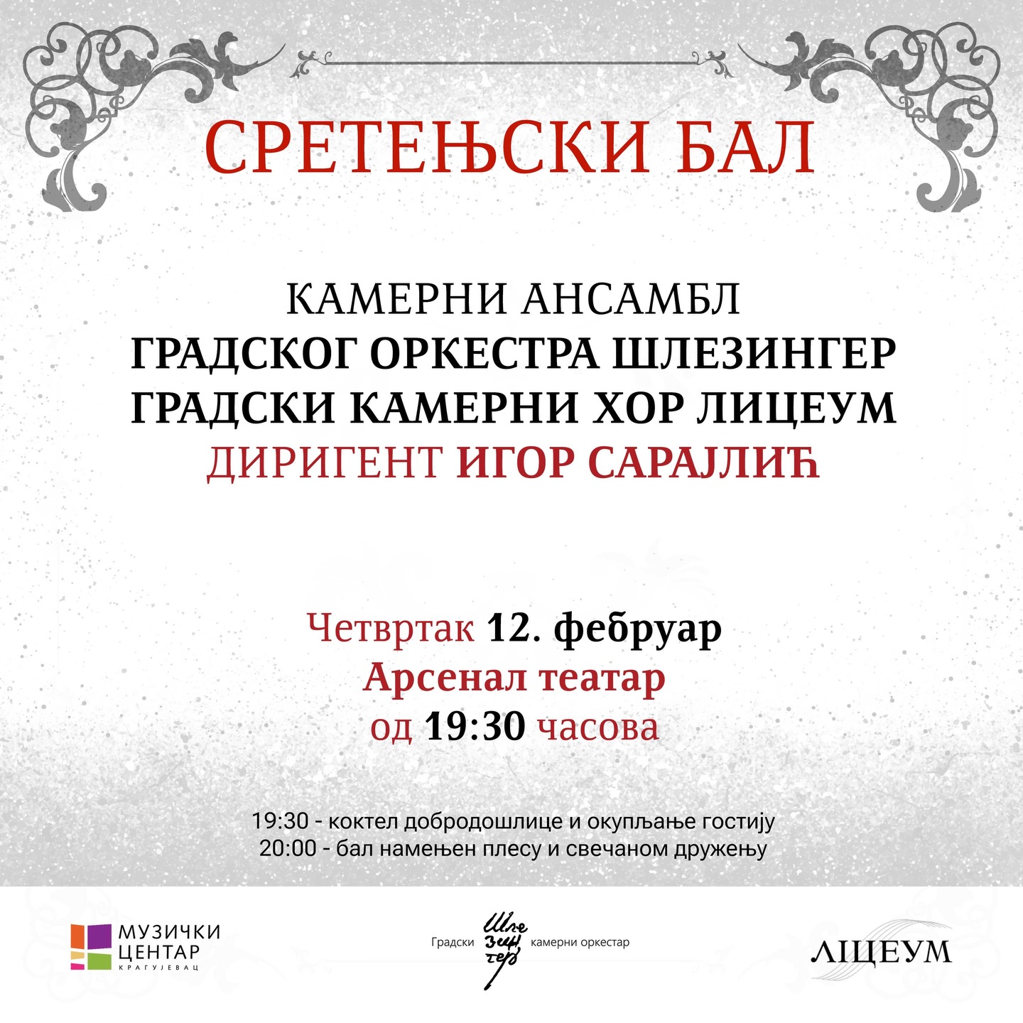 Поводом обележавања Дана државности, Музички центар организује свечани Сретењски бал у четвртак, 12. фебруара, од 19.30 часова, у Арсенал театру. У 20 часова почиње званични део програма — бал уз оркестар и хор, у којем су сви присутни позвани да активно учествују у плесу. Догађај нема професионалне плесне наступе, већ је осмишљен као заједничко свечано окупљање и уживање у музици, традицији и елеганцији. Арсенал театар смештен је у оквиру новоотвореног Арсенал хаба, на адреси Трг Тополиваца 3. Улаз је бесплатан.