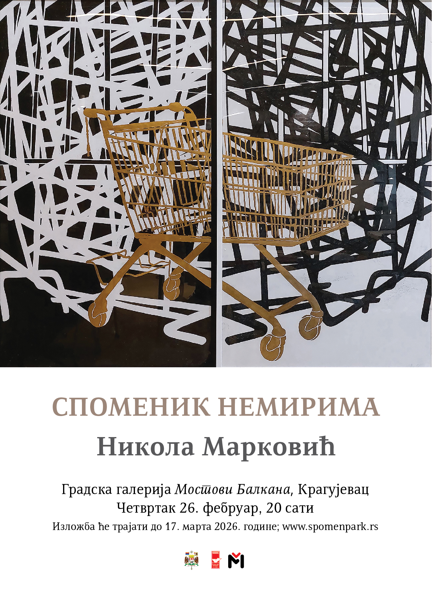 У четвртак, 26. фебруара, у 20 сати, у Градској галерији „Мостови Балкана“ биће отворена изложба цртежа Николе Марковића под називом „Споменик немирима“. Поставка се састоји од серије цртежа различитог формата, рађених у техници угљена и златних листића на папиру. Никола Марковић (1976) Факултет ликовних уметности завршио је у Београду, у класи проф. Чедомира Васића. Докторирао је на истом факултету, под менторством проф. Милете Продановића (коментор: проф. Чедомир Васић). Члан је УЛУС-а. У Србији је самостално излагао у Сомбору (2004), Нишу (2006 – Салон 77; 2018 – Салон 77; 2023 – Галерија „Арт 55“), Београду (2015 – Галерија УЛУС; 2016 – Продајна [...]