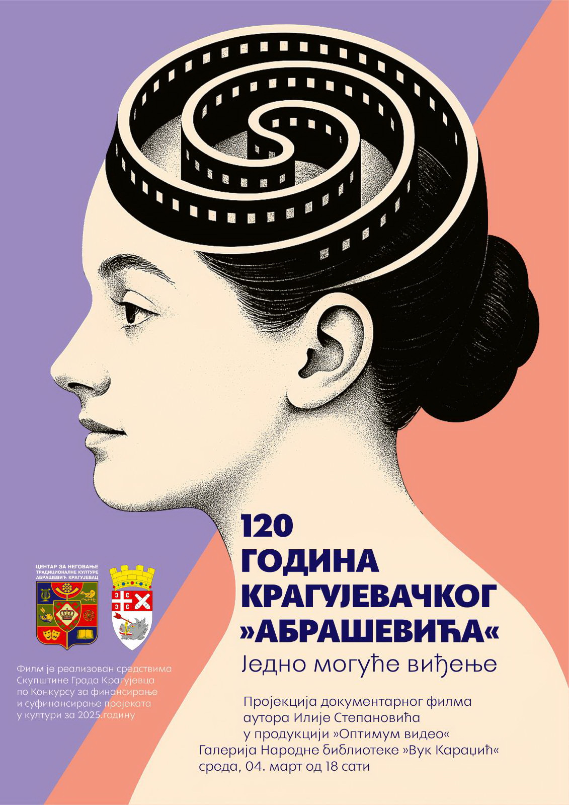 Среда, 4. март, 18 часова Галерија Народне библиотеке "Вук Караџић" Филм је настао у сарадњи продукцијске куће "Оптимум видео" и "Абрашевића" и финансиран је средствима Скупштине града Крагујевца по Конкурсу за суфинансирање пројеката у култури за 2025. годину.