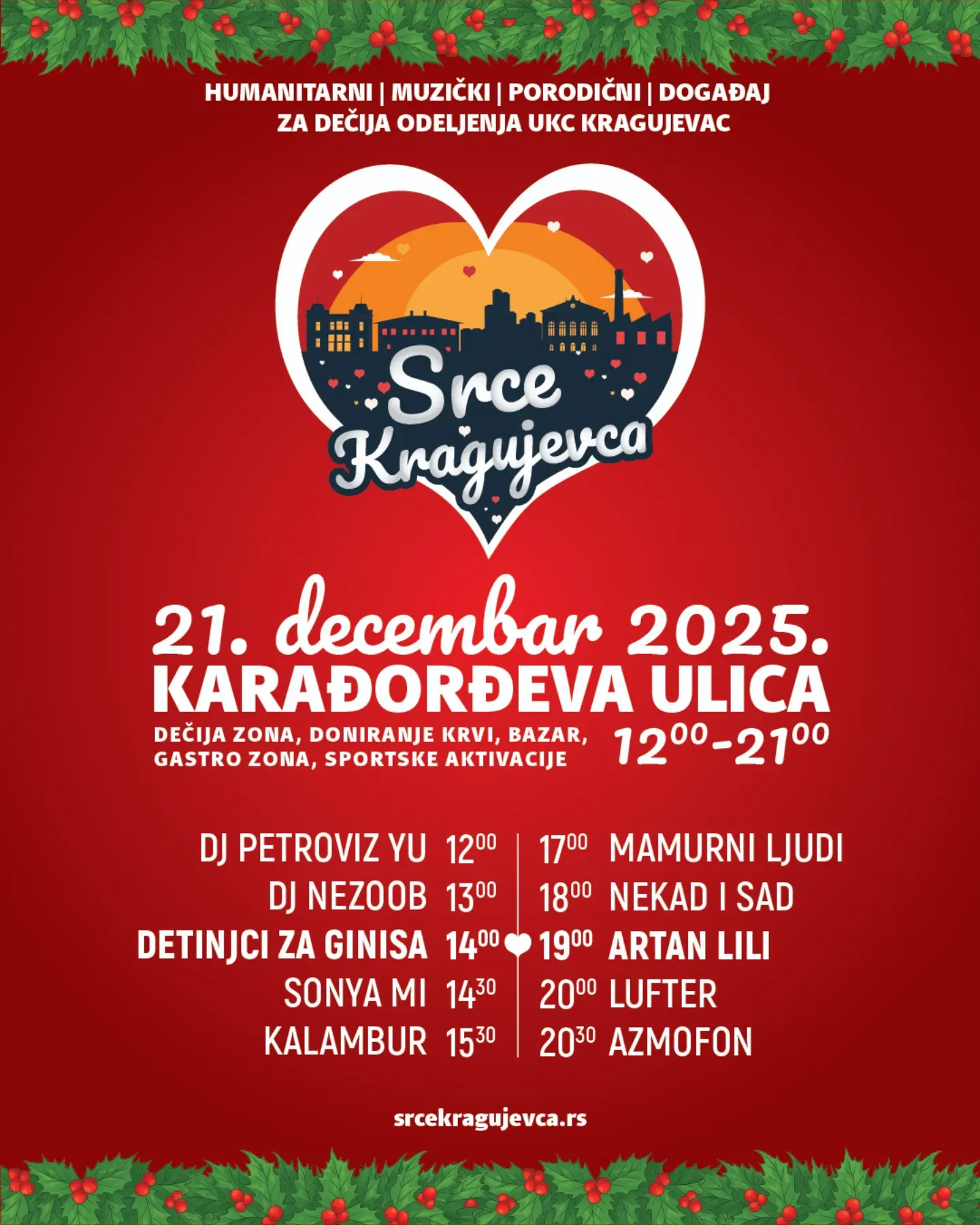 Хуманитарна, музичка и породична манифестација „Срце Крагујевца“ биће организована у недељу, 21. децембра у делу Кaрaђорђеве улице од 12 до 21 час.На манифестацији учествује преко 70 излагача, на Базару, гастро кутку и Дечјој зони. Посетиоци ће моћи да дегустирају кувано вино и ракију, кафу и чај, посне и мрсне специјалитете, купе рукотворине локалних произвођача, као и да се огреју уз ватру која ће бити ложена у бурићима. За најмлађе ће бити отворен Дечји кутак са реквизитима за игру и забаву и спортским анимацијама.Сав приход од продаје биће уручен дечјим клиникама Универзитетског клиничког центра Крагујевац.Сви који желе да подрже акцију, а нису [...]