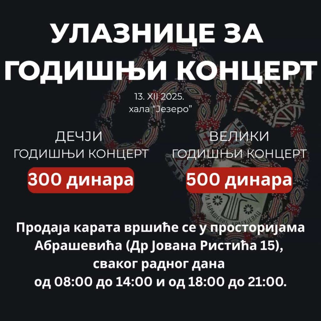 Велики годишњи концерт ЦЗНТК Абрашевић Крагујевац биће одржан у уторак, 13. децембар, у 17 сати, у Хали Језеро. Дечји годишњи концерт ће бити одржан од 12 сати. Цена улазнице за Велики концерт је 500 РСД, а за дечји 300 РСД. Улазнице се могу купити у просторијама Абрашевића.