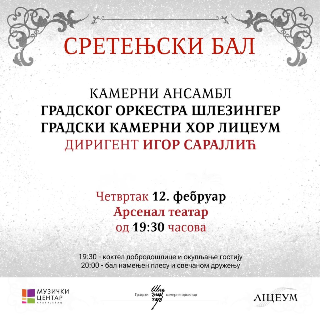 Поводом обележавања Дана државности, Музички центар организује свечани Сретењски бал у четвртак, 12. фебруара, од 19.30 часова, у Арсенал театру.